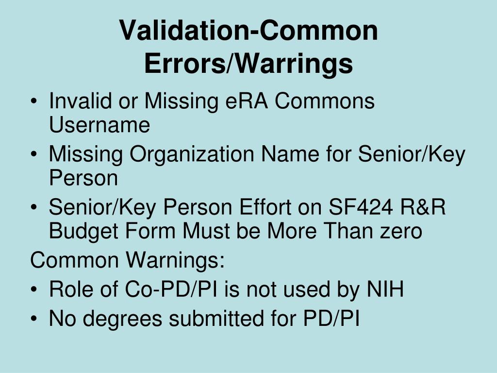 Validation-Common Errors/Warrings • Invalid or Missing eRA Commons Username • Missing Organization Name for Senior/Key Person • Senior/Key Person Effort on SF424 R&R Budget Form Must be More Than zero Common Warnings: • Role of Co-PD/PI is not used by NIH • No degrees submitted for PD/PI