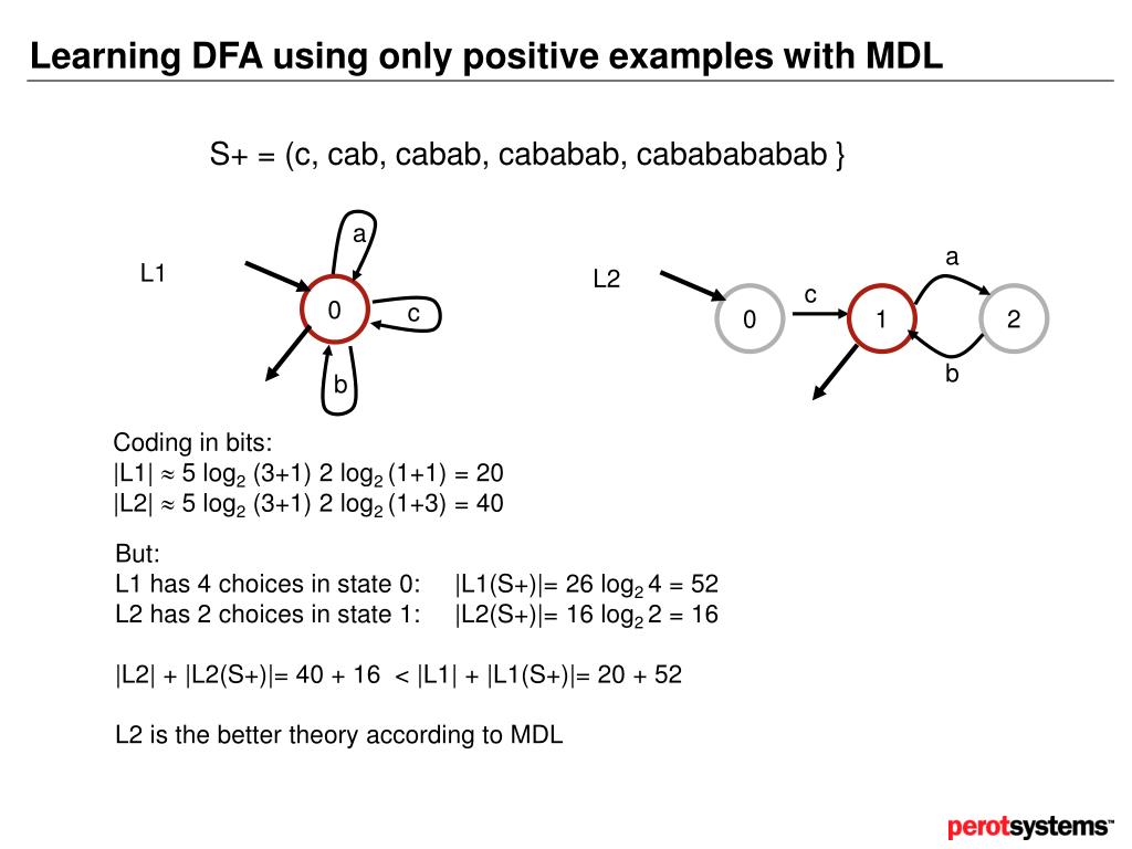 Learning DFA using only positive examples with MDL S+ = (c, cab, cabab, cababab, cababababab } a a L1 L2 c 0 0 1 2 c b b Coding in bits: |L1| 5 log2 (3+1) 2 log2 (1+1) = 20 |L2| 5 log2 (3+1) 2 log2 (1+3) = 40 But: L1 has 4 choices in state 0: |L1(S+)|= 26 log2 4 = 52 L2 has 2 choices in state 1: |L2(S+)|= 16 log2 2 = 16 |L2| + |L2(S+)|= 40 + 16 < |L1| + |L1(S+)|= 20 + 52 L2 is the better theory according to MDL