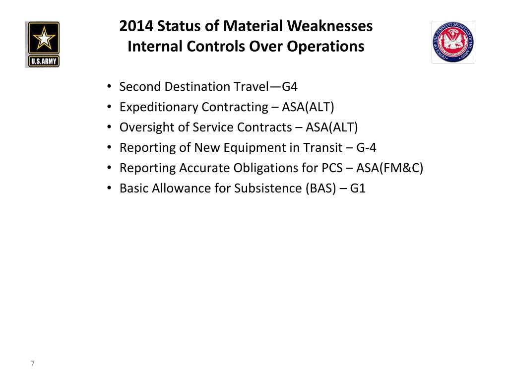 2014 Status of Material WeaknessesInternal Controls Over Operations • Second Destination Travel—G4 • Expeditionary Contracting – ASA(ALT) • Oversight of Service Contracts – ASA(ALT) • Reporting of New Equipment in Transit – G-4 • Reporting Accurate Obligations for PCS – ASA(FM&C) • Basic Allowance for Subsistence (BAS) – G1