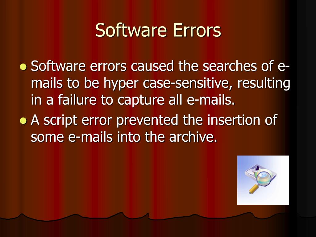 Software Errors • Software errors caused the searches of e-mails to be hyper case-sensitive, resulting in a failure to capture all e-mails. • A script error prevented the insertion of some e-mails into the archive.