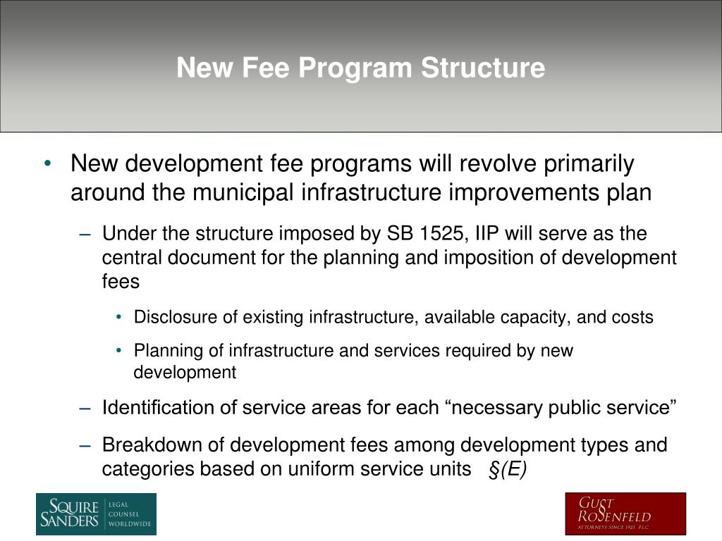 New Fee Program Structure • New development fee programs will revolve primarily around the municipal infrastructure improvements plan • Under the structure imposed by SB 1525, IIP will serve as the central document for the planning and imposition of development fees • Disclosure of existing infrastructure, available capacity, and costs • Planning of infrastructure and services required by new development • Identification of service areas for each “necessary public service” • Breakdown of development fees among development types and categories based on uniform service units §(E)