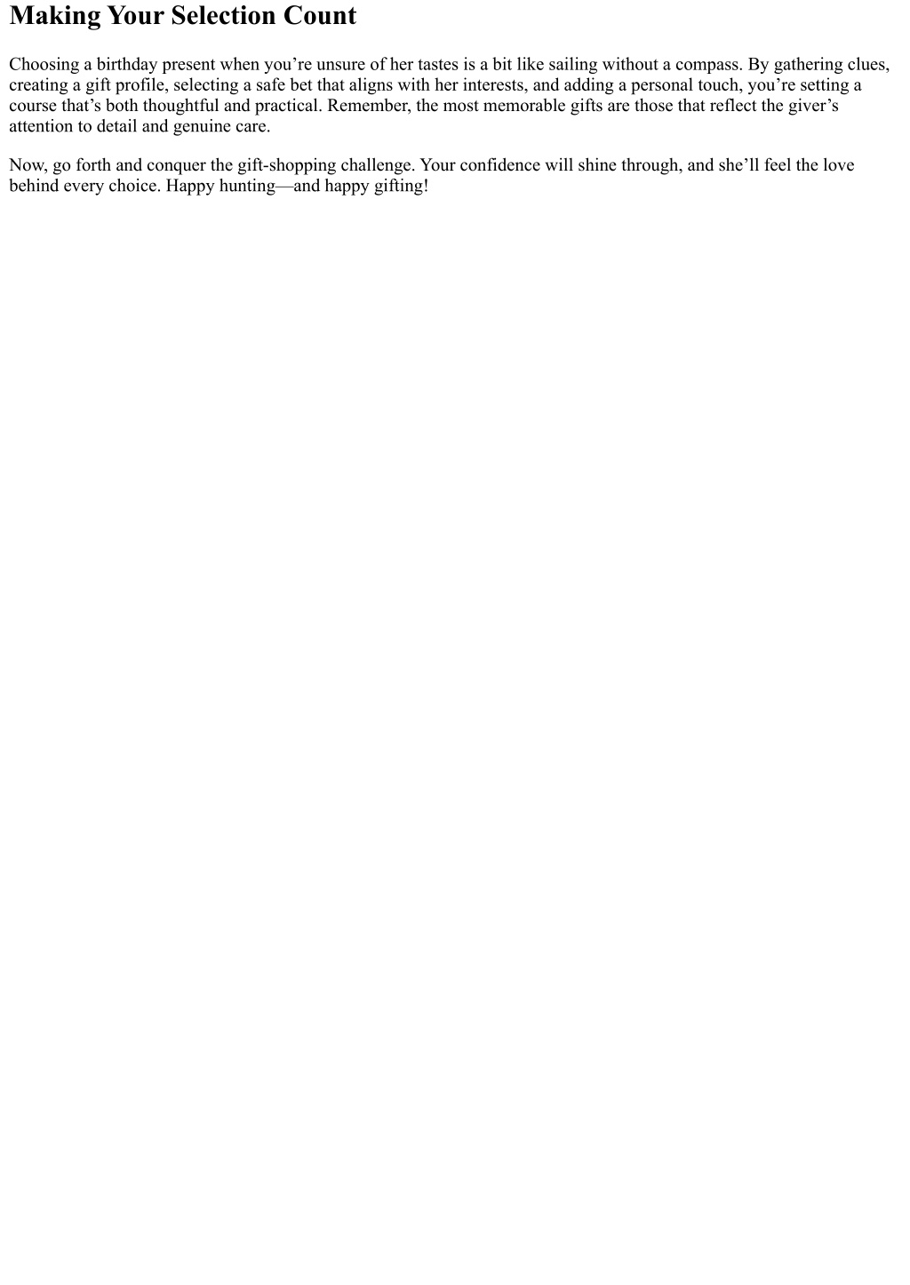 Making Your Selection Count Choosing a birthday present when you’re unsure of her tastes is a bit like sailing without a compass. By gathering clues, creating a gift profile, selecting a safe bet that aligns with her interests, and adding a personal touch, you’re setting a course that’s both thoughtful and practical. Remember, the most memorable gifts are those that reflect the giver’s attention to detail and genuine care. Now, go forth and conquer the gift‑shopping challenge. Your confidence will shine through, and she’ll feel the love behind every choice. Happy hunting—and happy gifting!