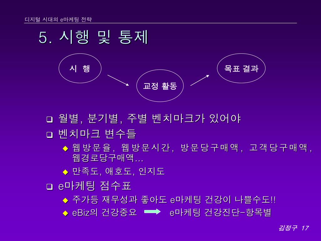 디지털 시대의 e마케팅 전략 성공적인 ebiz를 위한 시사점 • ebiz는 기술에서 벗어나 전략이 중심이 된다. 좋은 아이디어와 시스템만으로는 충분치 않음 전략이 필요 • Fully integrated value chain을 갖춘 대기업 vs. Info-mediaries “many new dot-com companies are like fireflies before the storm- all stirred up, throwing off sparks.” • ebiz의 중심에는 마케팅 !! e마케팅이 핵심 고객가치 창출 !! 김정구 4
