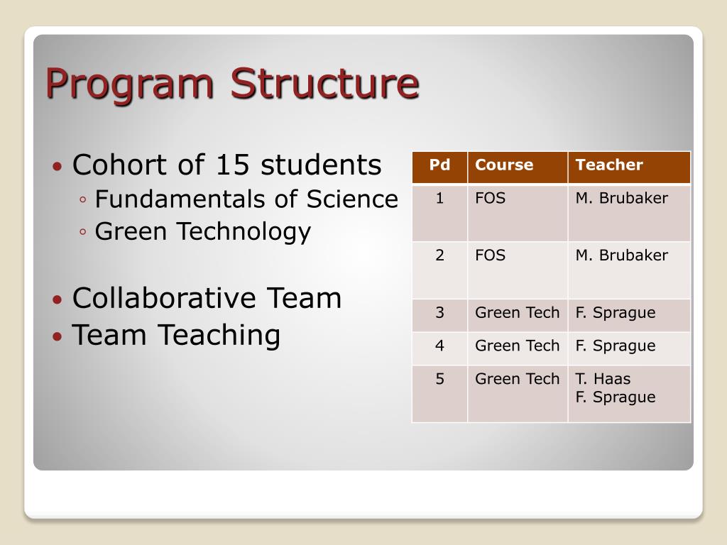 Cohort of 15 students • Fundamentals of Science • Green Technology • Collaborative Team • Team Teaching Program Structure