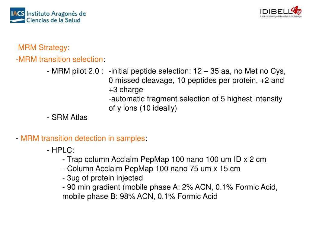 Limitations • -Validation and specificity of MRM transitions by MSMS/MIDAS (MRM Initiated Detection and Sequencing) difficult due to sample complexity and low sensitivity of our MS equipment. • -In highly complex samples like the ones we are dealing, it is highly unlikely that the peptide corresponding to the transition will be within the most intense ones and it will be fragmented …… • Alternatives: • - validate MSMS in shot-gun high sensitive equipment (orbis or similars) • - SILAC labeling of cell culture, for transition/retention time specifity • - aqua-synthetic peptides