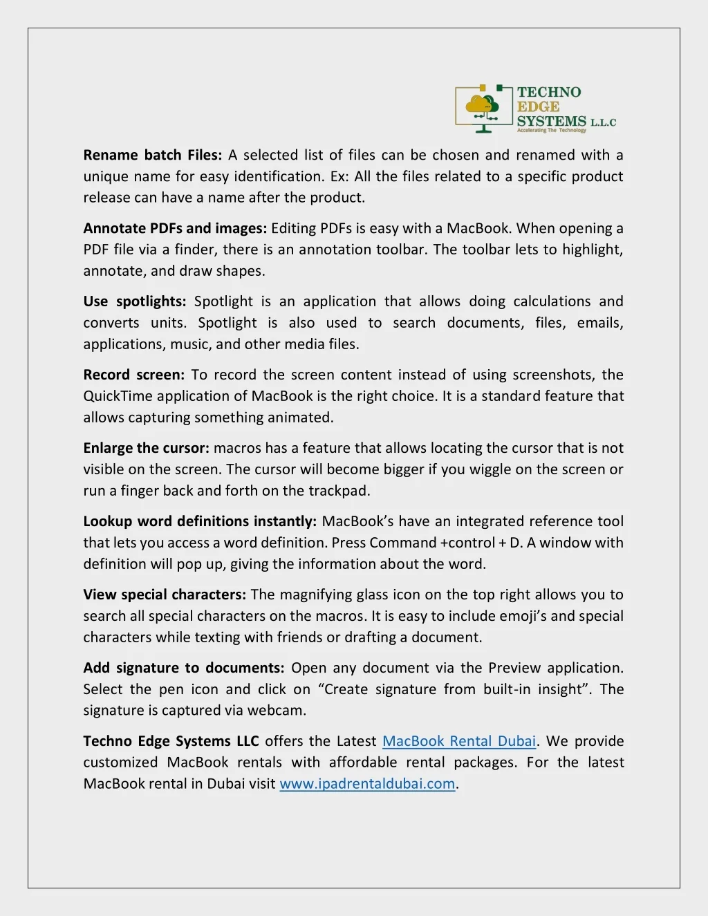 Rename batch Files: A selected list of files can be chosen and renamed with a unique name for easy identification. Ex: All the files related to a specific product release can have a name after the product. Annotate PDFs and images: Editing PDFs is easy with a MacBook. When opening a PDF file via a finder, there is an annotation toolbar. The toolbar lets to highlight, annotate, and draw shapes. Use spotlights: Spotlight is an application that allows doing calculations and converts units. Spotlight is also used to search documents, files, emails, applications, music, and other media files. Record screen: To record the screen content instead of using screenshots, the QuickTime application of MacBook is the right choice. It is a standard feature that allows capturing something animated. Enlarge the cursor: macros has a feature that allows locating the cursor that is not visible on the screen. The cursor will become bigger if you wiggle on the screen or run a finger back and forth on the trackpad. Lookup word definitions instantly:MacBook’s have an integrated reference tool that lets you access a word definition. Press Command +control + D. A window with definition will pop up, giving the information about the word. View special characters: The magnifying glass icon on the top right allows you to search all special characters on the macros. It is easy to include emoji’s and special characters while texting with friends or drafting a document. Add signature to documents: Open any document via the Preview application. Select the pen icon and click on “Create signature from built-in insight”. The signature is captured via webcam. Techno Edge Systems LLC offers the Latest MacBook Rental Dubai. We provide customized MacBook rentals with affordable rental packages. For the latest MacBook rental in Dubai visit www.ipadrentaldubai.com.