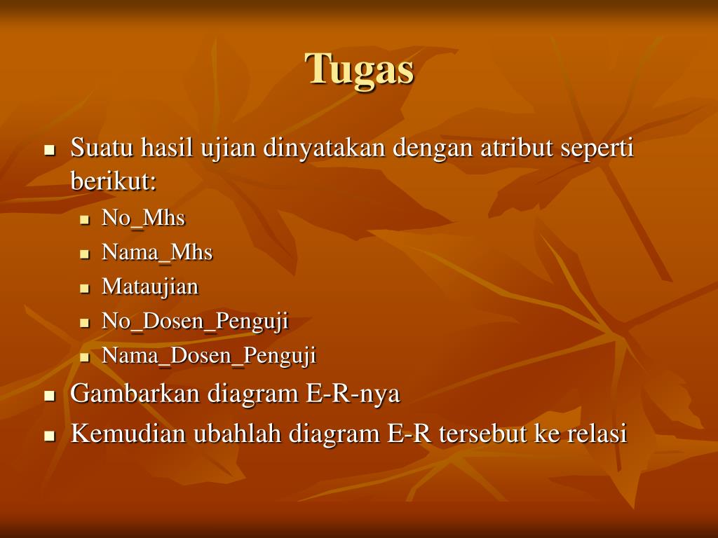 Tugas • Suatu hasil ujian dinyatakan dengan atribut seperti berikut: • No_Mhs • Nama_Mhs • Mataujian • No_Dosen_Penguji • Nama_Dosen_Penguji • Gambarkan diagram E-R-nya • Kemudian ubahlah diagram E-R tersebut ke relasi