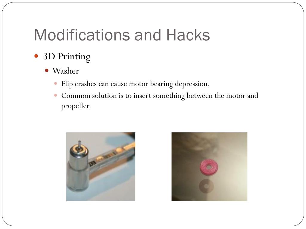 Modifications and Hacks • 3D Printing • Washer • Flip crashes can cause motor bearing depression. • Common solution is to insert something between the motor and propeller.