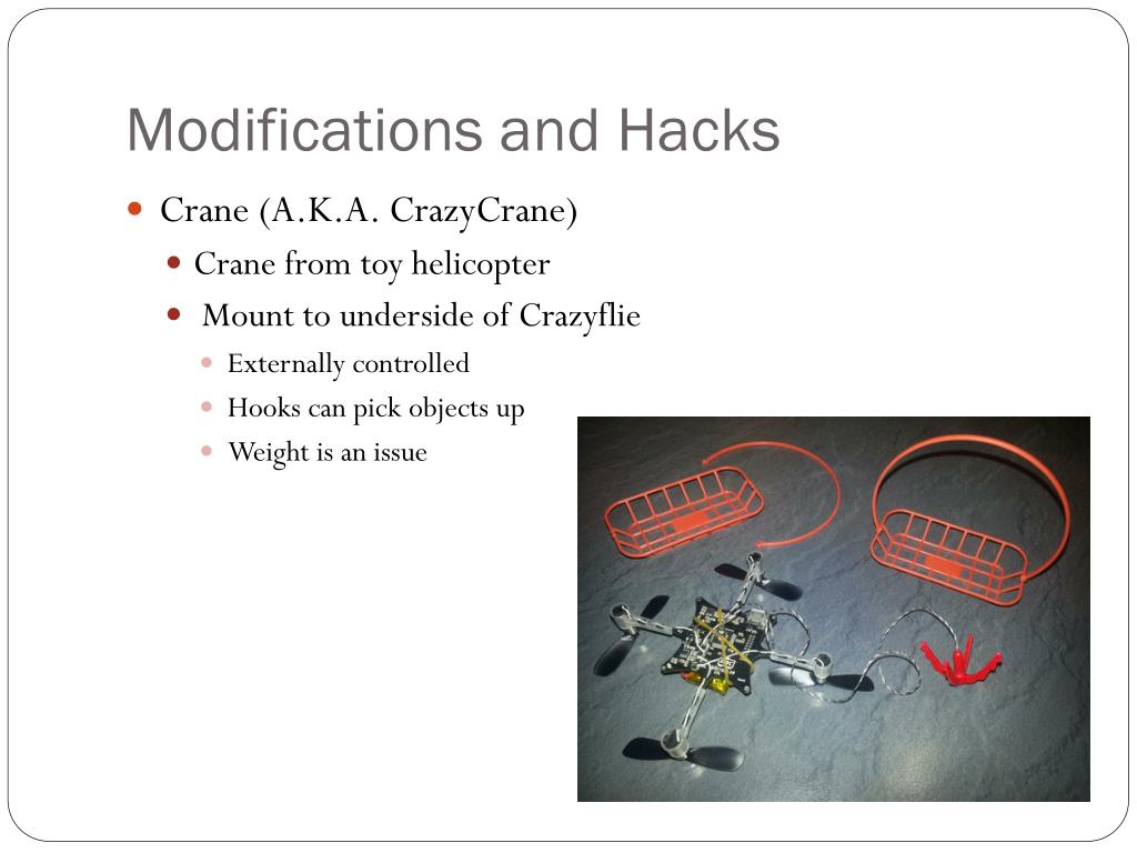 Modifications and Hacks • Crane (A.K.A. CrazyCrane) • Crane from toy helicopter • Mount to underside of Crazyflie • Externally controlled • Hooks can pick objects up • Weight is an issue