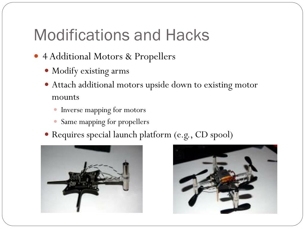 Modifications and Hacks • 4 Additional Motors & Propellers • Modify existing arms • Attach additional motors upside down to existing motor mounts • Inverse mapping for motors • Same mapping for propellers • Requires special launch platform (e.g., CD spool)