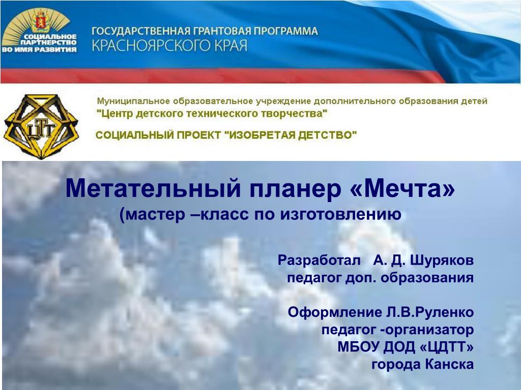 Метательный планер «Мечта»(мастер –класс по изготовлению Разработал А. Д. Шуряков педагог доп. образования Оформление Л.В.Руленко педагог -организатор МБОУ ДОД «ЦДТТ» города Канска