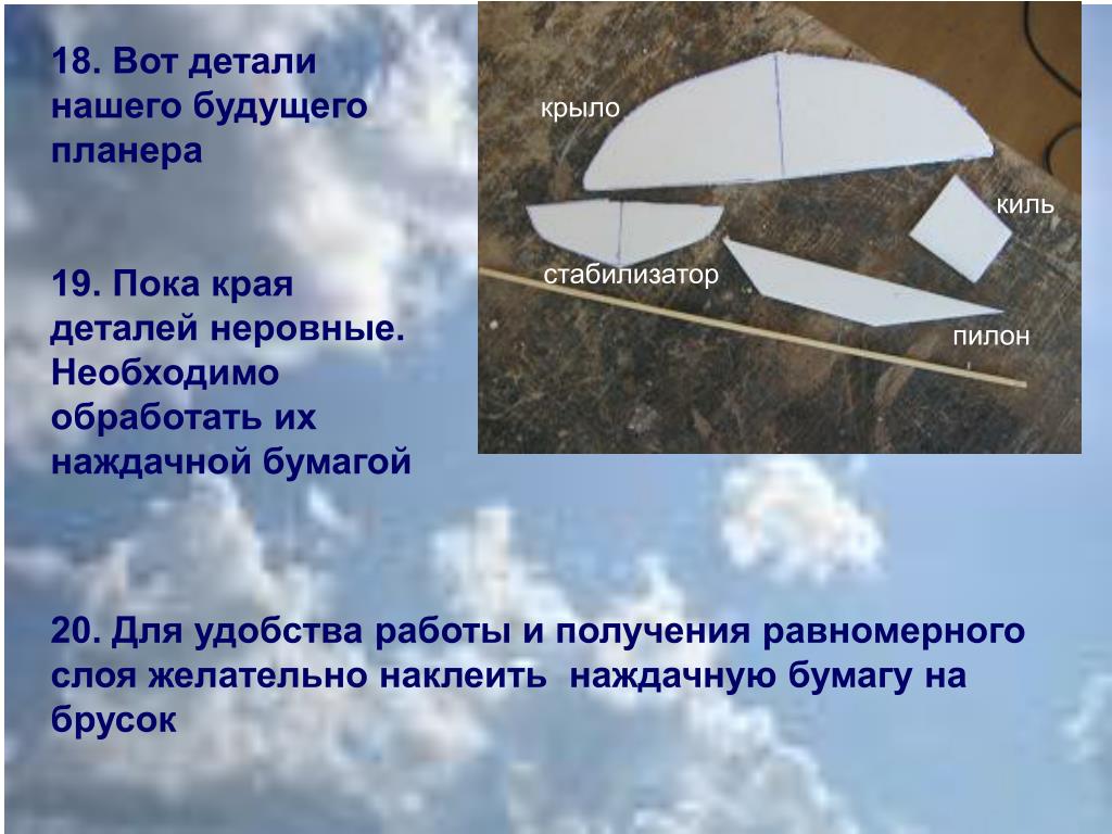 18. Вот детали нашего будущего планера 19. Пока края деталей неровные. Необходимо обработать их наждачной бумагой крыло киль стабилизатор пилон 20. Для удобства работы и получения равномерного слоя желательно наклеить наждачную бумагу на брусок