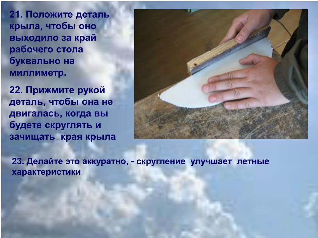 21. Положите деталь крыла, чтобы оно выходило за край рабочего стола буквально на миллиметр. 22. Прижмите рукой деталь, чтобы она не двигалась, когда вы будете скруглять и зачищать края крыла 23. Делайте это аккуратно, - скругление улучшает летные характеристики