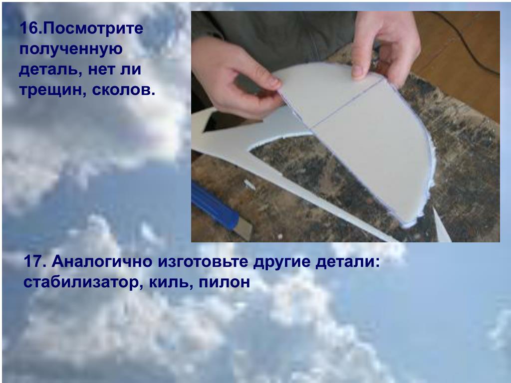16.Посмотрите полученную деталь, нет ли трещин, сколов. 17. Аналогично изготовьте другие детали: стабилизатор, киль, пилон