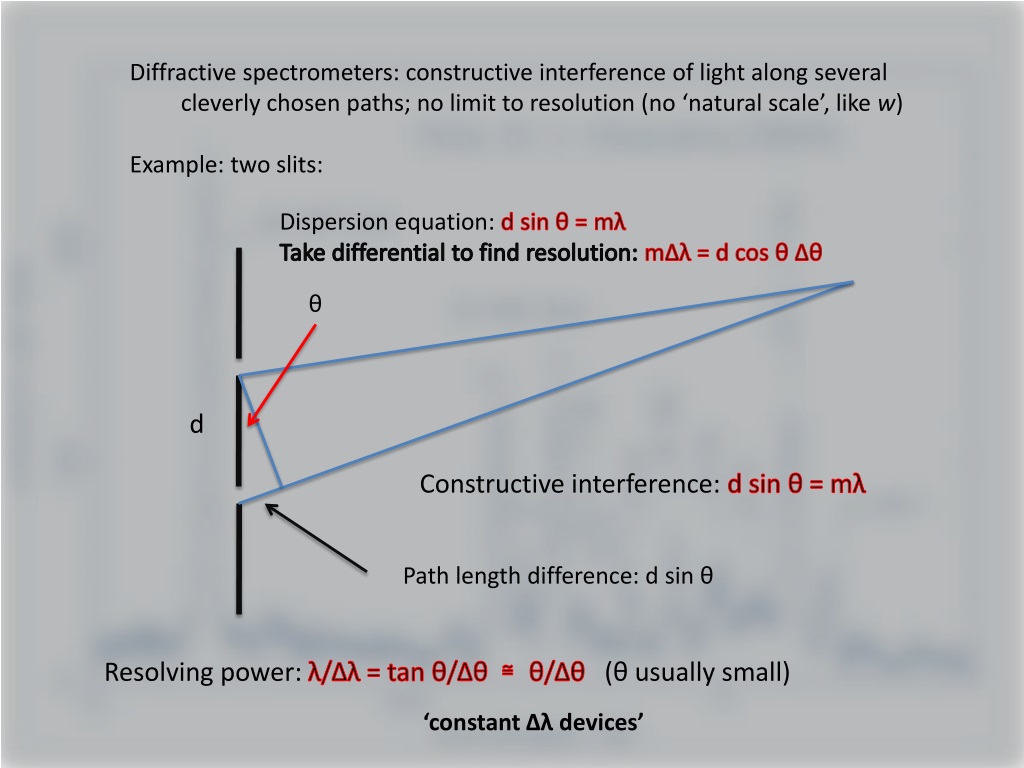 Diffractive spectrometers: constructive interference of light along several cleverly chosen paths; no limit to resolution (no ‘natural scale’, like w) Example: two slits: Dispersion equation: d sin θ = mλ Take differential to find resolution: mΔλ = dcosθΔθ θ d Constructive interference: d sin θ = mλ Path length difference: d sin θ Resolving power: λ/Δλ = tan θ/Δθ≅ θ/Δθ(θ usually small) ‘constant Δλ devices’
