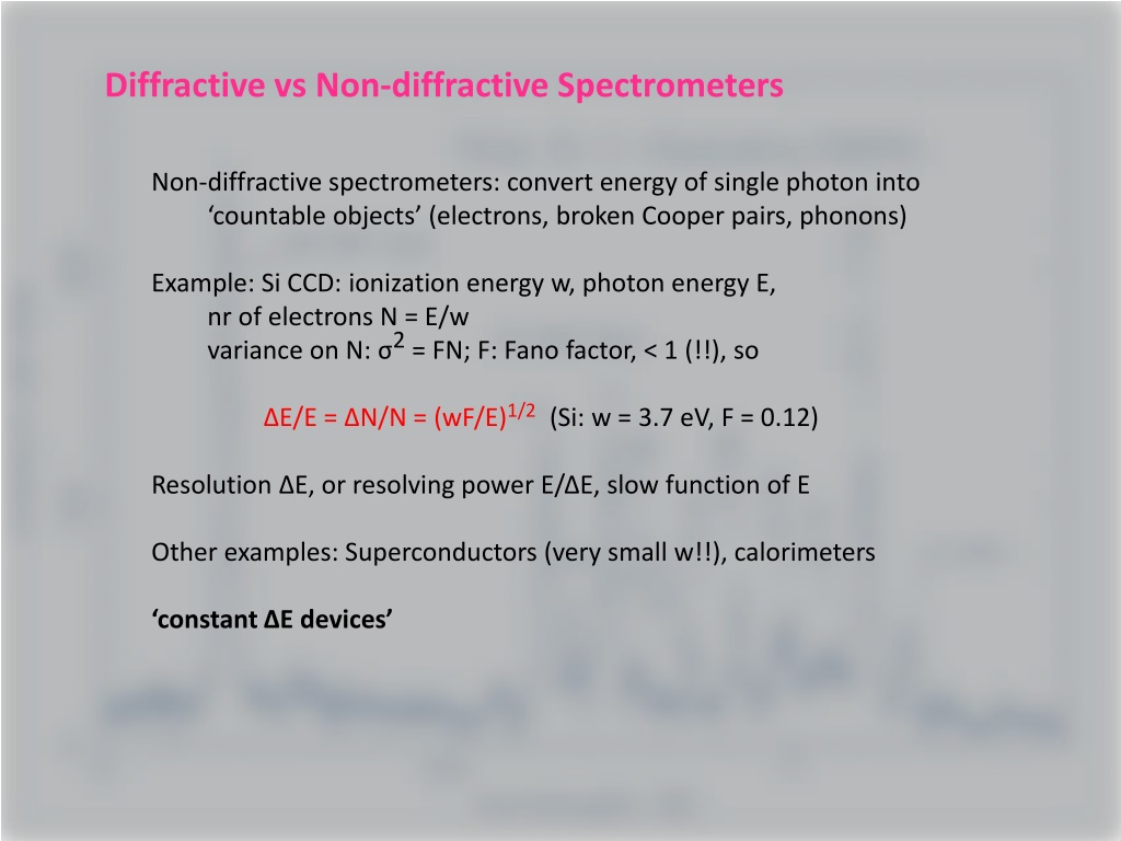 Diffractive vs Non-diffractive Spectrometers Non-diffractive spectrometers: convert energy of single photon into ‘countable objects’ (electrons, broken Cooper pairs, phonons) Example: Si CCD: ionization energy w, photon energy E, nr of electrons N = E/w variance on N: σ2 = FN; F: Fano factor, < 1 (!!), so ΔE/E = ΔN/N = (wF/E)1/2(Si: w = 3.7 eV, F = 0.12) Resolution ΔE, or resolving power E/ΔE, slow function of E Other examples: Superconductors (very small w!!), calorimeters ‘constant ΔE devices’
