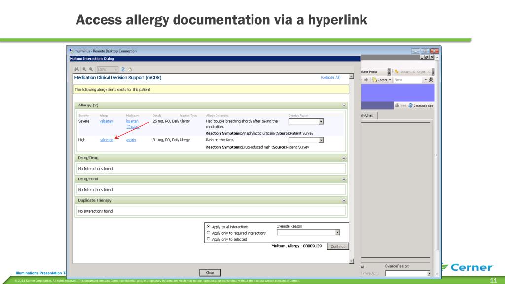 Generic name/Synonym/Order Details for medication causing the allergy warning are available