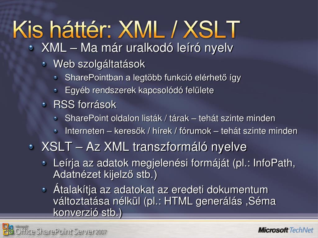 Kis háttér: XML / XSLT • XML – Ma már uralkodó leíró nyelv • Web szolgáltatások • SharePointban a legtöbb funkció elérhető így • Egyéb rendszerek kapcsolódó felülete • RSS források • SharePoint oldalon listák / tárak – tehát szinte minden • Interneten – keresők / hírek / fórumok – tehát szinte minden • XSLT – Az XML transzformáló nyelve • Leírja az adatok megjelenési formáját (pl.: InfoPath, Adatnézet kijelző stb.) • Átalakítja az adatokat az eredeti dokumentum változtatása nélkül (pl.: HTML generálás ,Séma konverzió stb.)