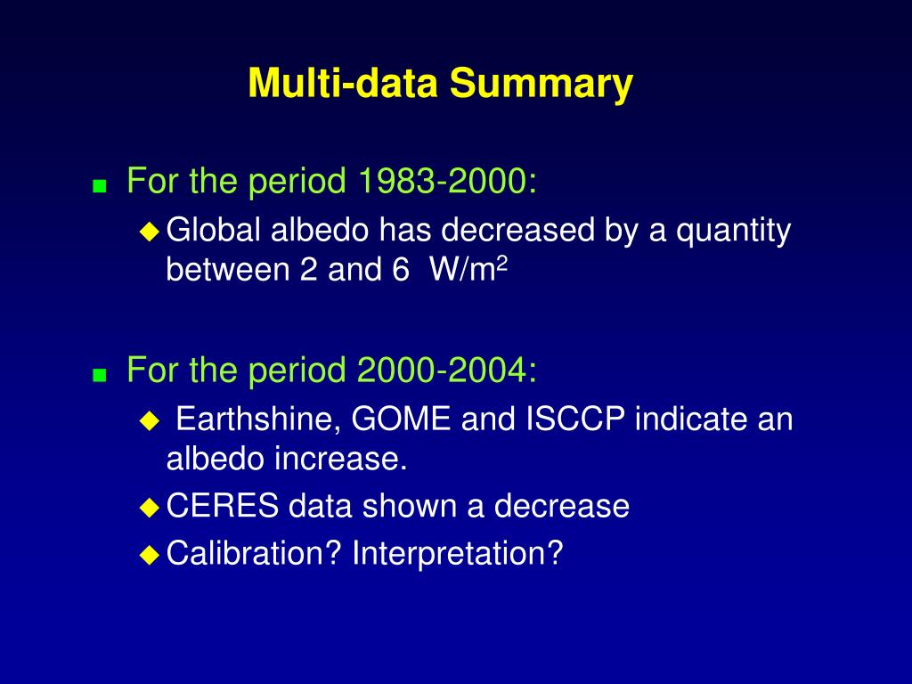 Multi-data Summary • For the period 1983-2000: • Global albedo has decreased by a quantity between 2 and 6 W/m2 • For the period 2000-2004: • Earthshine, GOME and ISCCP indicate an albedo increase. • CERES data shown a decrease • Calibration? Interpretation?
