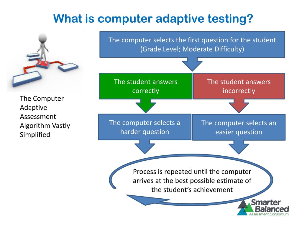 What is computer adaptive testing? The computer selects the first question for the student (Grade Level; Moderate Difficulty) The student answers correctly The student answers incorrectly The Computer Adaptive Assessment Algorithm Vastly Simplified The computer selects a harder question The computer selects an easier question Process is repeated until the computer arrives at the best possible estimate of the student’s achievement