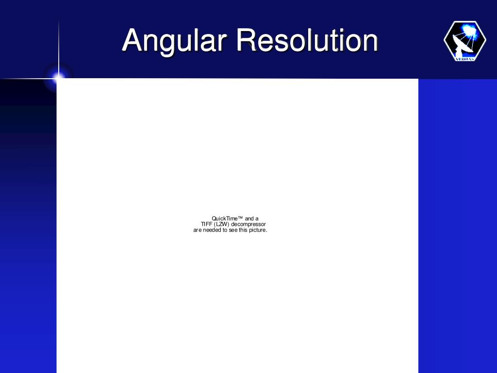 VERITAS Sensitivity 5σ Detection Sensitivity 1% Crab in 47 hours 5% Crab in 2.5 hours • Measured sensitivity to theCrab Nebula at high elevation (>65°) • HESS ~ 1% Crab in 25 hours • MAGIC ~ 2% Crab in 50 hours
