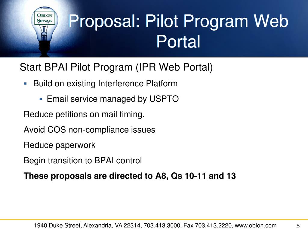 Proposal: Pilot Program Web Portal Start BPAI Pilot Program (IPR Web Portal) • Build on existing Interference Platform • Email service managed by USPTO Reduce petitions on mail timing. Avoid COS non-compliance issues Reduce paperwork Begin transition to BPAI control These proposals are directed to A8, Qs 10-11 and 13 1940 Duke Street, Alexandria, VA 22314, 703.413.3000, Fax 703.413.2220, www.oblon.com