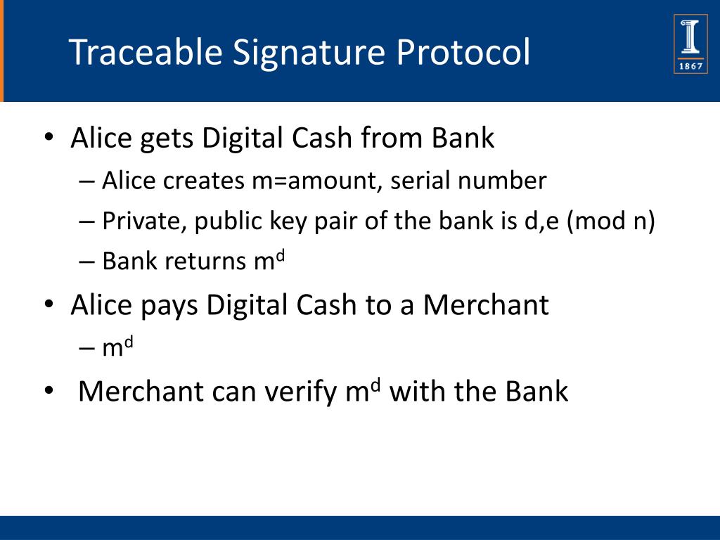 Traceable Signature Protocol Alice gets Digital Cash from Bank Alice creates m=amount, serial number Private, public key pair of the bank is d,e (mod n) Bank returns md Alice pays Digital Cash to a Merchant md Merchant can verify md with the Bank