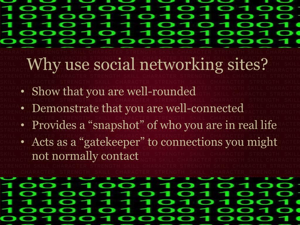 Why use social networking sites? • Show that you are well-rounded • Demonstrate that you are well-connected • Provides a “snapshot” of who you are in real life • Acts as a “gatekeeper” to connections you might not normally contact