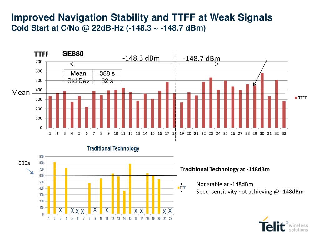 Improved Navigation Stability and TTFF at Weak SignalsCold Start at C/No @ 22dB-Hz (-148.3 ~ -148.7 dBm) SE880 J-Air -148.3 dBm -148.7 dBm Mean 600s • Traditional Technology at -148dBm • Not stable at -148dBm • Spec- sensitivity not achieving @ -148dBm