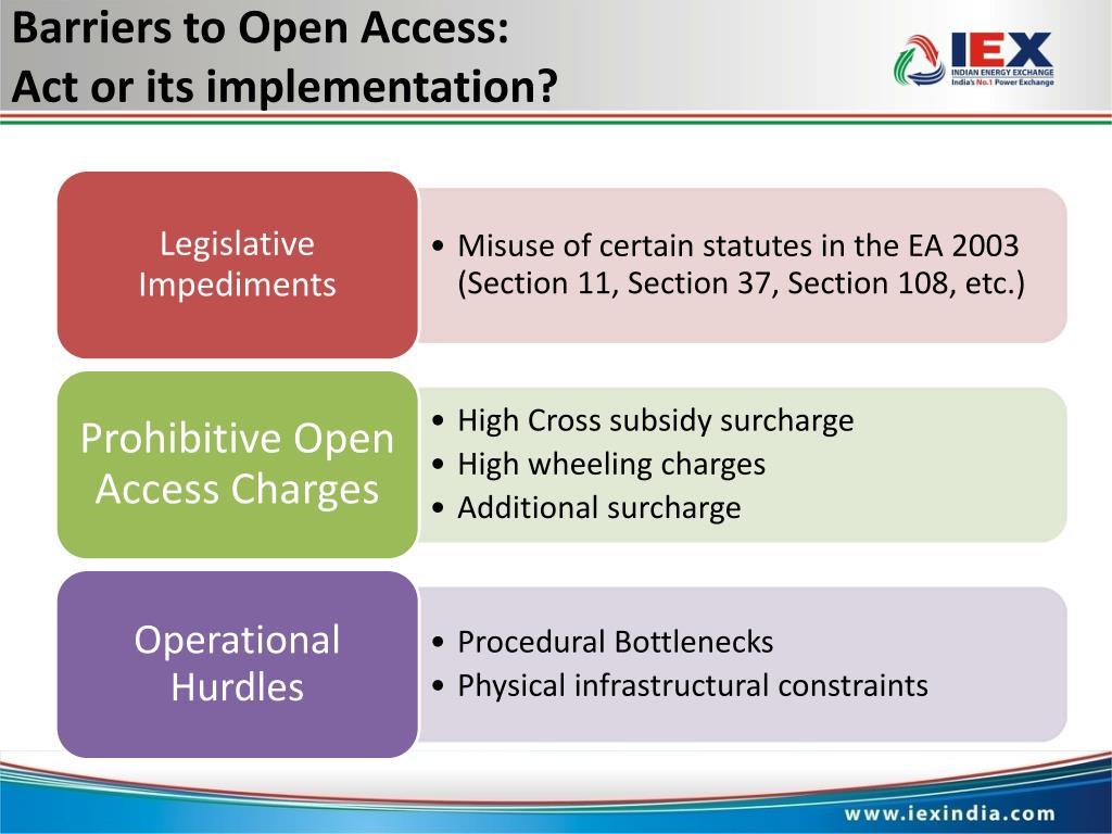 Open Access: Prevented and denied • Restrictive Open access regulations across states: • Punjab: High wheeling charges are deterrent to OA • Haryana: Notification for only RTC & peak hour procurement • Tamilnadu: Section 11 • West Bengal: Very high OA charges; CSS not determined in consistence with mechanism in NTP 2006 • Maharashtra/UP/Jharkhand/Delhi/ East& NE: Resistance by utility