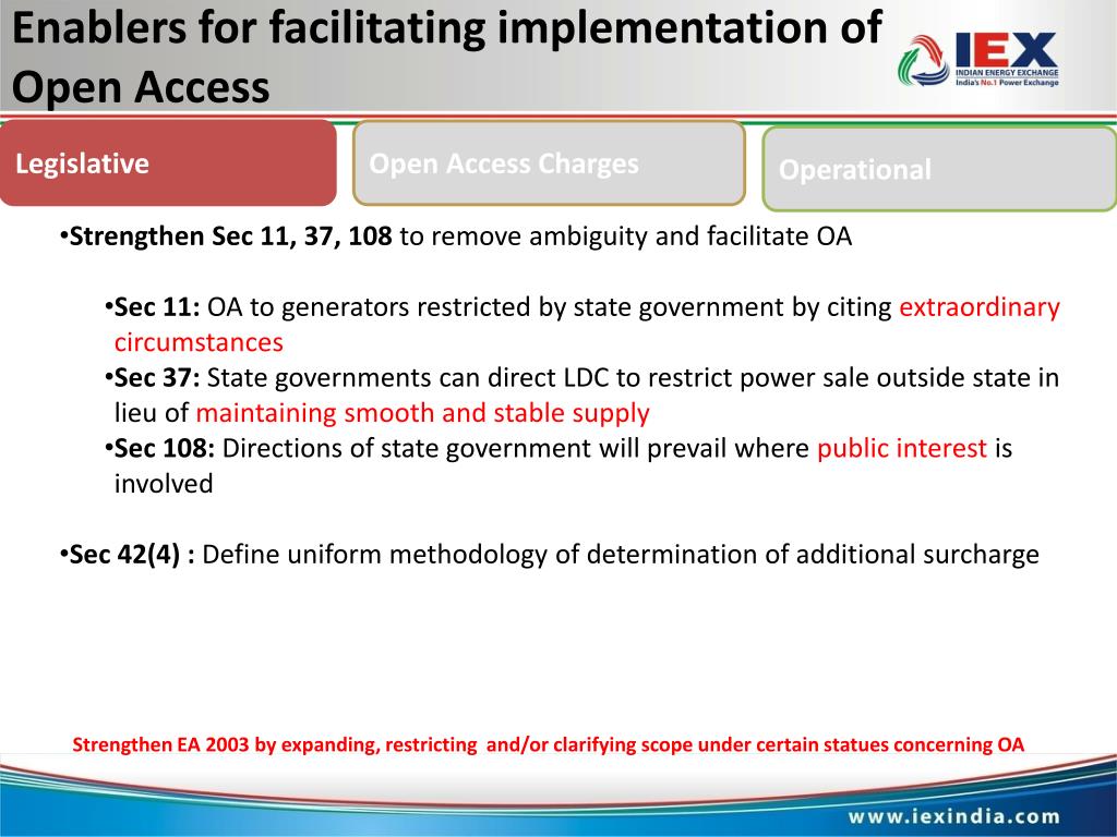Enablers for facilitating implementation of Open Access Legislative Open Access Charges Operational • Strengthen Sec 11, 37, 108 to remove ambiguity and facilitate OA • Sec 11: OA to generators restricted by state government by citing extraordinary circumstances • Sec 37: State governments can direct LDC to restrict power sale outside state in lieu of maintaining smooth and stable supply • Sec 108: Directions of state government will prevail where public interest is involved • Sec 42(4) : Define uniform methodology of determination of additional surcharge Strengthen EA 2003 by expanding, restricting and/or clarifying scope under certain statues concerning OA