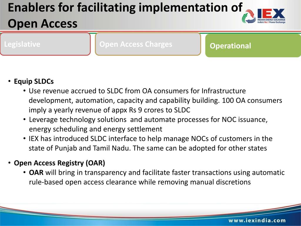 Enablers for facilitating implementation of Open Access Legislative Open Access Charges Operational • Equip SLDCs • Use revenue accrued to SLDC from OA consumers for Infrastructure development, automation, capacity and capability building. 100 OA consumers imply a yearly revenue of appx Rs 9 crores to SLDC • Leverage technology solutions and automate processes for NOC issuance, energy scheduling and energy settlement • IEX has introduced SLDC interface to help manage NOCs of customers in the state of Punjab and Tamil Nadu. The same can be adopted for other states • Open Access Registry (OAR) • OAR will bring in transparency and facilitate faster transactions using automatic rule-based open access clearance while removing manual discretions