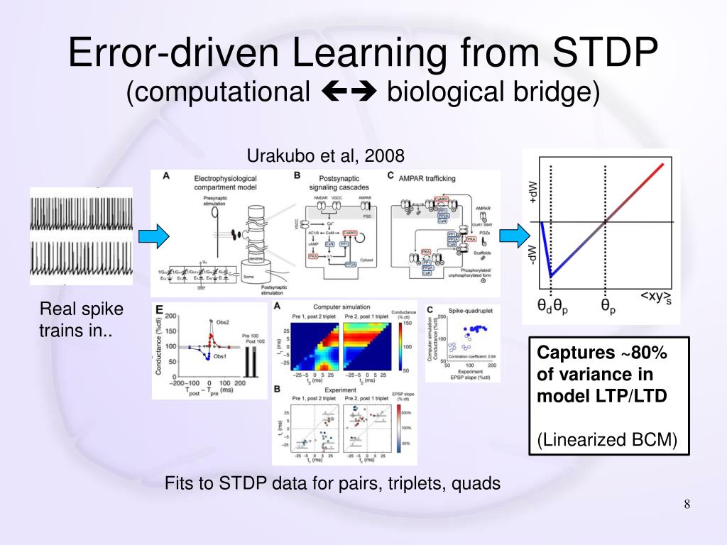 Error-driven Learning from STDP(computational biological bridge) Urakubo et al, 2008 Real spike trains in.. Captures ~80% of variance in model LTP/LTD (Linearized BCM) Fits to STDP data for pairs, triplets, quads