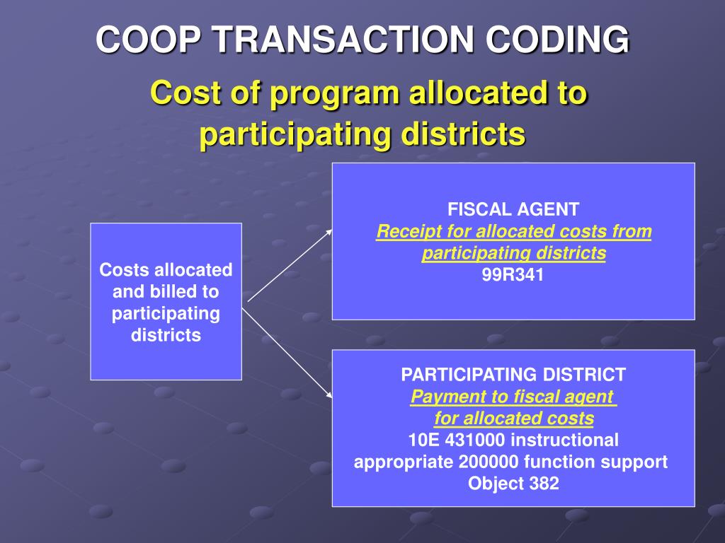 COOP TRANSACTION CODINGCost of program allocated to participating districts FISCAL AGENT Receipt for allocated costs from participating districts 99R341 Costs allocated and billed to participating districts PARTICIPATING DISTRICT Payment to fiscal agent for allocated costs 10E 431000 instructional appropriate 200000 function support Object 382