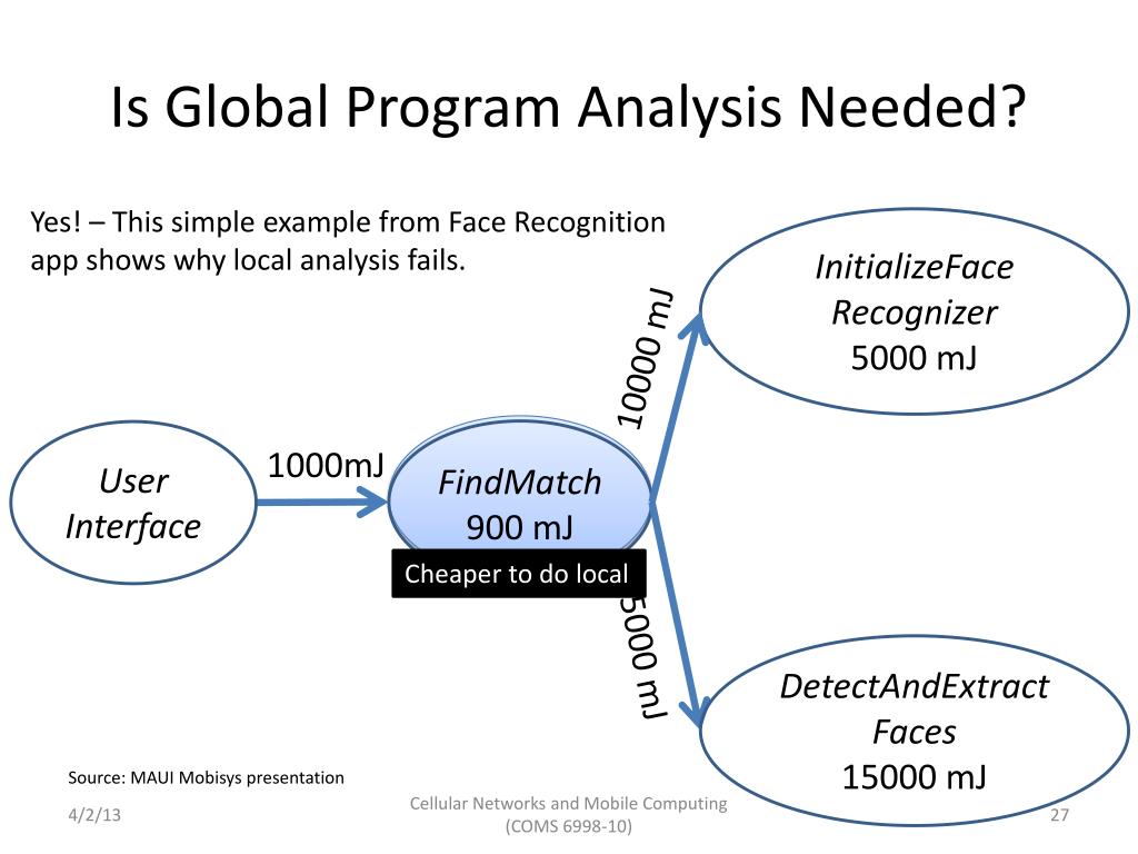 Is Global Program Analysis Needed? InitializeFaceRecognizer UserInterface FindMatch 1000mJ 25900mJ Cheaper to offload DetectAndExtract Faces Source: MAUI Mobisys presentation Cellular Networks and Mobile Computing (COMS 6998-10)