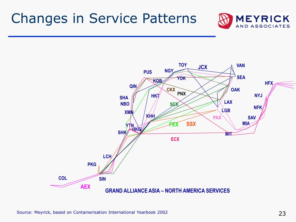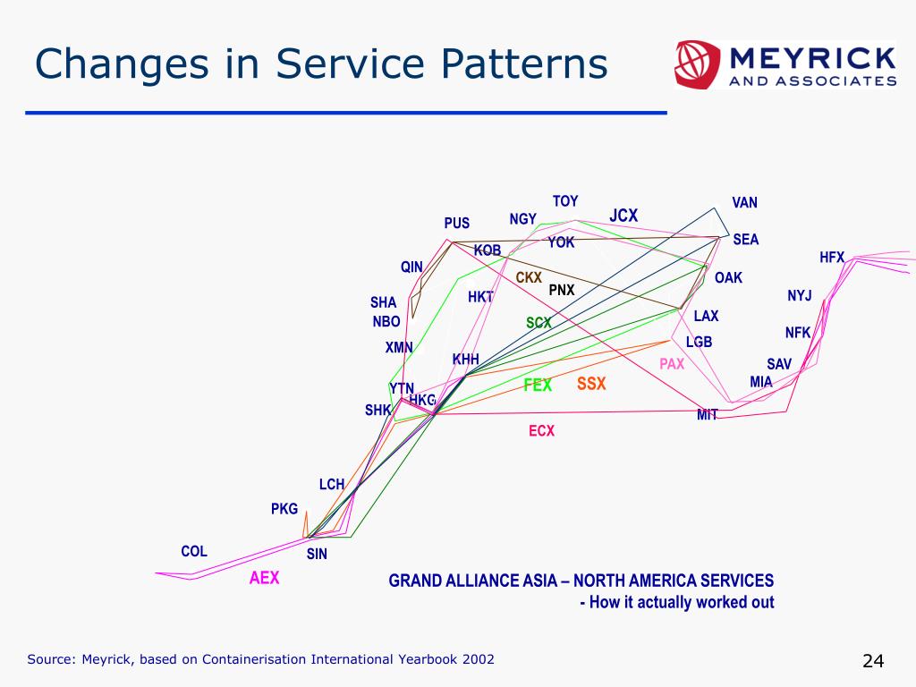 JCX CKX PNX SCX PAX SSX FEX ECX AEX Changes in Service Patterns TOY VAN NGY PUS SEA YOK KOB HFX QIN OAK NYJ HKT SHA LAX NBO NFK LGB XMN KHH SAV MIA YTN HKG SHK MIT LCH PKG COL SIN GRAND ALLIANCE ASIA – NORTH AMERICA SERVICES Source: Meyrick, based on Containerisation International Yearbook 2002