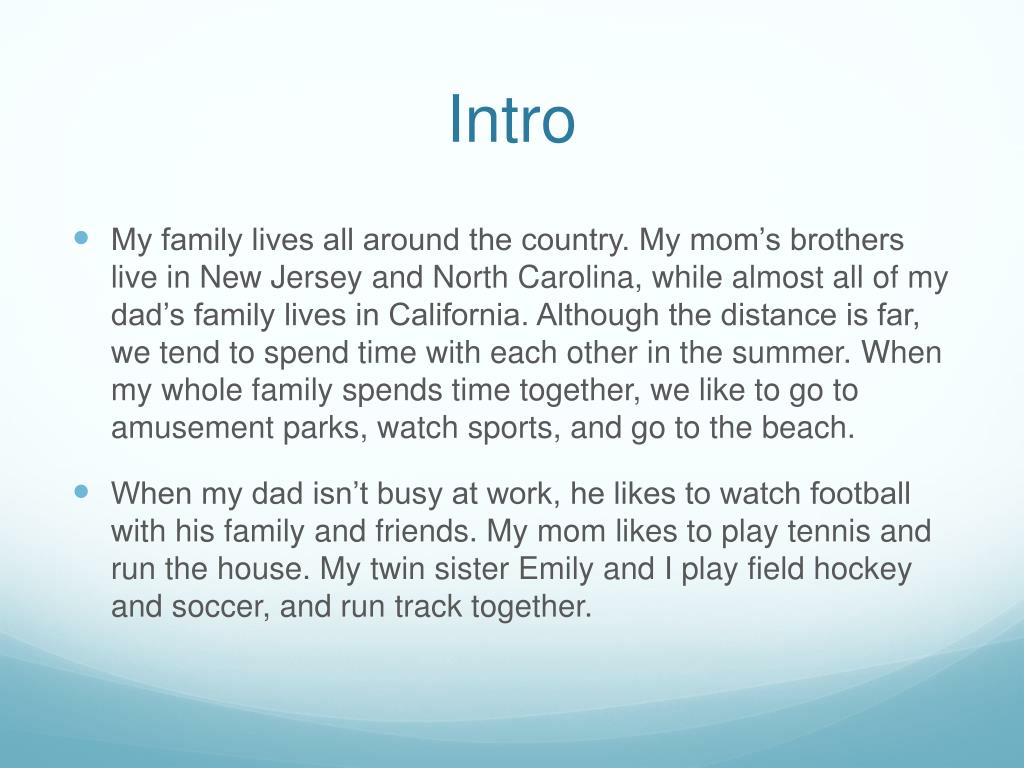 Intro • My family lives all around the country. My mom’s brothers live in New Jersey and North Carolina, while almost all of my dad’s family lives in California. Although the distance is far, we tend to spend time with each other in the summer. When my whole family spends time together, we like to go to amusement parks, watch sports, and go to the beach. • When my dad isn’t busy at work, he likes to watch football with his family and friends. My mom likes to play tennis and run the house. My twin sister Emily and I play field hockey and soccer, and run track together.