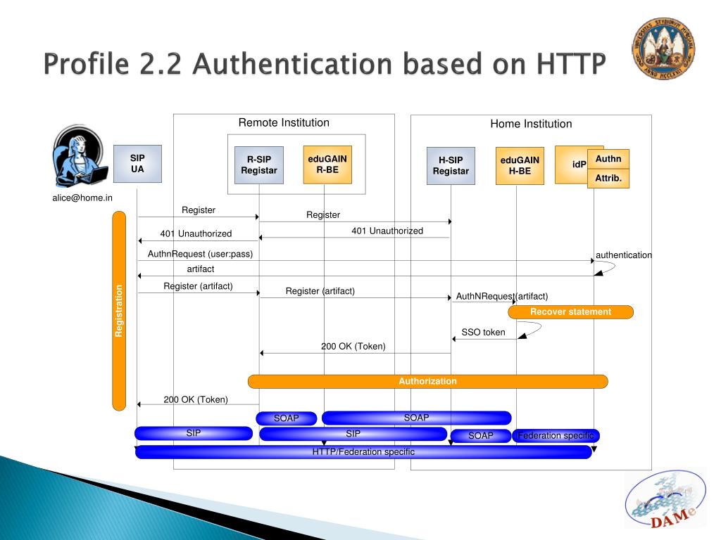 Profile 2.2 Authentication based on HTTP • Extension of SIP messages: • REGISTER (artifact) • OK 200 (token) • HTTP redirection authN • Extension of SIP proxies: • Token generation request BEs • Authorization based on end user and environment attributes BEs