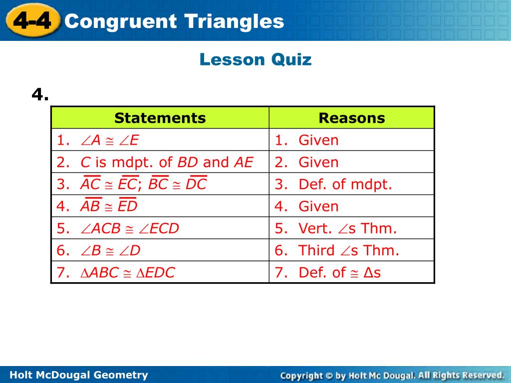 Statements Reasons 1. A E 1. Given 2. C is mdpt. of BD and AE 2. Given 3. AC EC; BC DC 3. Def. of mdpt. 4. AB ED 4. Given 5. ACB ECD 5. Vert. s Thm. 6. B D 6. Third s Thm. 7. ABC EDC 7. Def. of ∆s Lesson Quiz 4.