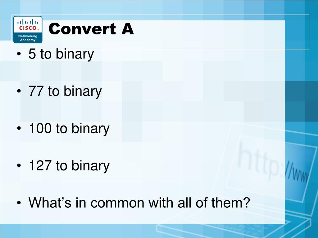 Convert A • 5 to binary • 77 to binary • 100 to binary • 127 to binary • What’s in common with all of them?