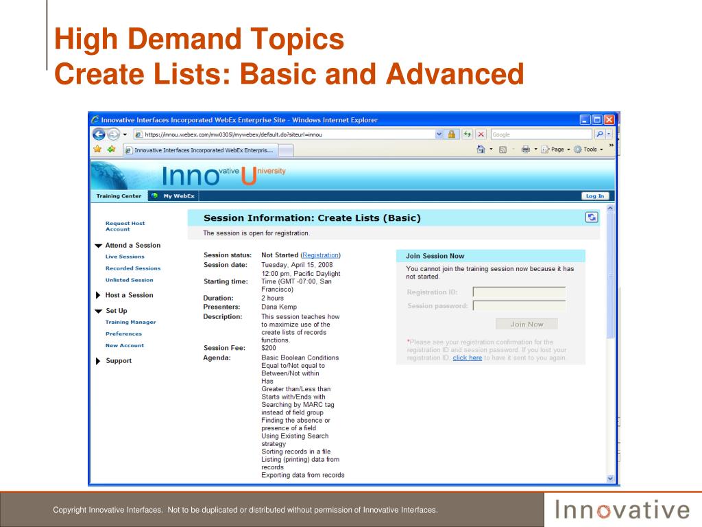 Innovative University Topics • Create Lists (Basic) • Fiscal Close • EDIFACT Ordering • Selection Lists • Global Update • Heading Changes Report • Circulation Parameters Explored • Create Lists (Advance) • Holds Management Overview • Circulation Reports and Notices • System Access and Permissions • Z39.50 Servers Set Up • Serials Checkin and Claiming More to come…