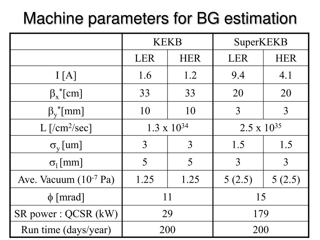 Shower of Spent Particles • Beam-Gas scattering origin • HER / LER currents: 1.2/1.6 A 4.1/9.4 A • x4 Worse Vacuum : 1~1.5x10-7 Pa 5x10-7 Pa • x13.6 (HER), x23.6 (LER) higher contribution • Touschek origin • Almost same effective beam size ~ 0.88 ( 1/2 @IP) • shorter bunch length ~ 3mm/7mm • higher bunch current ~ 1.51 times • many #bunch ~ 3.9 times • Uncertainty of dynamic aperture factor 2 uncertainty for Bkg • currently just 10% of total BG • x(23.5~41) higher contribution (bunch current)^2 / (beam volume) x #bunch
