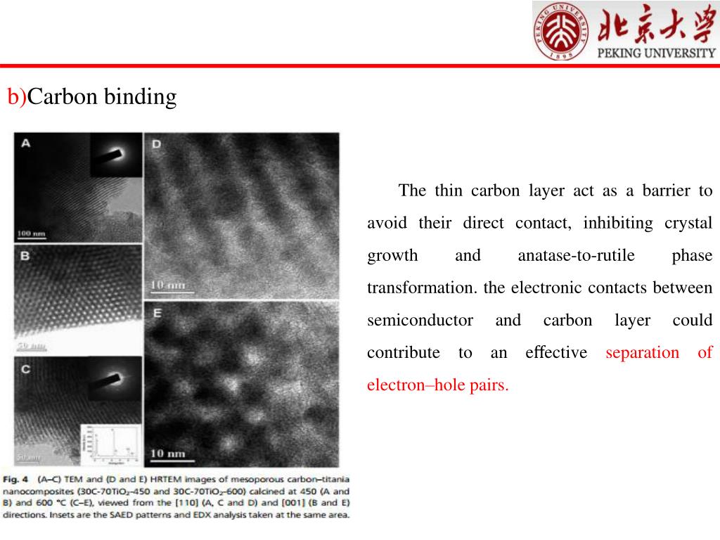 b)Carbon binding The thin carbon layer act as a barrier to avoid their direct contact, inhibiting crystal growth and anatase-to-rutile phase transformation. the electronic contacts between semiconductor and carbon layer could contribute to an effectiveseparation of electron–hole pairs.