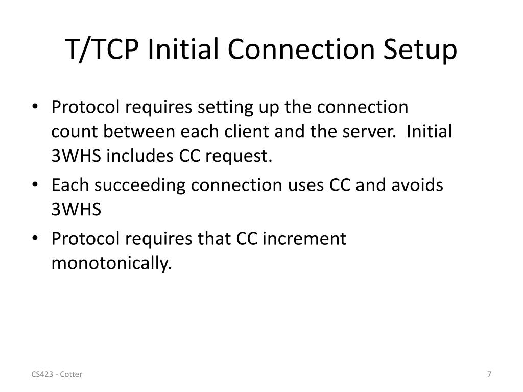 T/TCP Initial Connection Setup • Protocol requires setting up the connection count between each client and the server. Initial 3WHS includes CC request. • Each succeeding connection uses CC and avoids 3WHS • Protocol requires that CC increment monotonically.