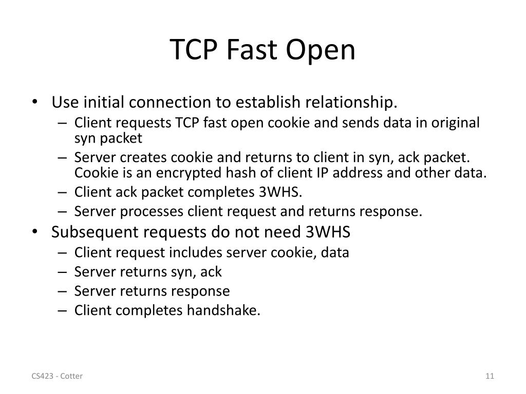 TCP Fast Open • Use initial connection to establish relationship. • Client requests TCP fast open cookie and sends data in original syn packet • Server creates cookie and returns to client in syn, ack packet. Cookie is an encrypted hash of client IP address and other data. • Client ack packet completes 3WHS. • Server processes client request and returns response. • Subsequent requests do not need 3WHS • Client request includes server cookie, data • Server returns syn, ack • Server returns response • Client completes handshake.