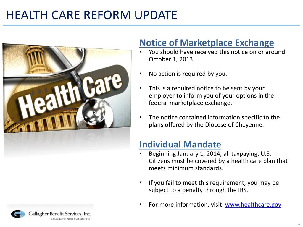 HEALTH CARE REFORM UPDATE • Notice of Marketplace Exchange • You should have received this notice on or around October 1, 2013. • No action is required by you. • This is a required notice to be sent by your employer to inform you of your options in the federal marketplace exchange. • The notice contained information specific to the plans offered by the Diocese of Cheyenne. • Individual Mandate • Beginning January 1, 2014, all taxpaying, U.S. Citizens must be covered by a health care plan that meets minimum standards. • If you fail to meet this requirement, you may be subject to a penalty through the IRS. • For more information, visit www.healthcare.gov