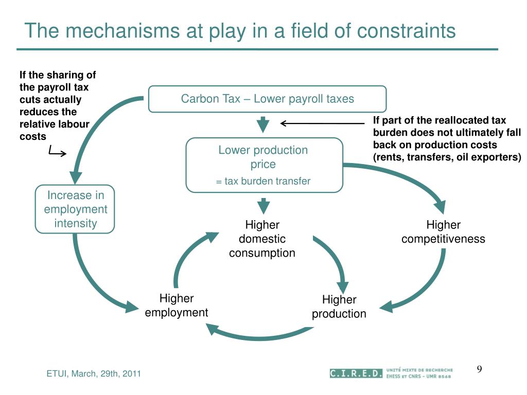 Carbon Tax – Lower payroll taxes The mechanisms at play in a field of constraints If the sharing of the payroll tax cuts actually reduces the relative labour costs If part of the reallocated tax burden does not ultimately fall back on production costs (rents, transfers, oil exporters) Lower production price = tax burden transfer Increase inemployment intensity Higherdomestic consumption Highercompetitiveness Higheremployment Higher production ETUI, March, 29th, 2011