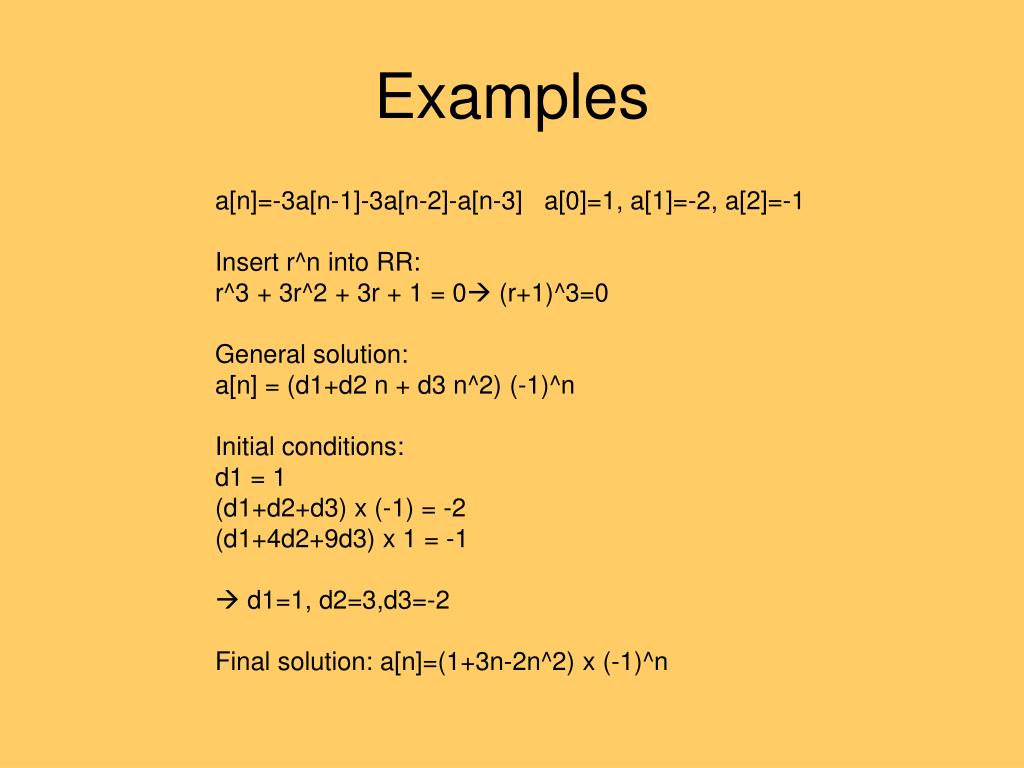 Examples a[n]=-3a[n-1]-3a[n-2]-a[n-3] a[0]=1, a[1]=-2, a[2]=-1 Insert r^n into RR: r^3 + 3r^2 + 3r + 1 = 0 (r+1)^3=0 General solution: a[n] = (d1+d2 n + d3 n^2) (-1)^n Initial conditions: d1 = 1 (d1+d2+d3) x (-1) = -2 (d1+4d2+9d3) x 1 = -1 d1=1, d2=3,d3=-2 Final solution: a[n]=(1+3n-2n^2) x (-1)^n