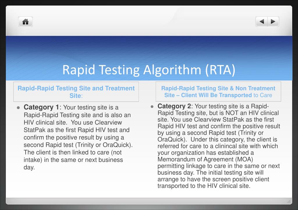 Rapid Testing Algorithm (RTA) Rapid-Rapid Testing Site and Treatment Site: Rapid-Rapid Testing Site & Non Treatment Site – Client Will Be Transported to Care Category 2: Your testing site is a Rapid-Rapid Testing site, but is NOT an HIV clinical site. You use ClearviewStatPak as the first Rapid HIV test and confirm the positive result by using a second Rapid test (Trinity or OraQuick). Under this category, the client is referred for care to a clinincal site with which your organization has established a Memorandum of Agreement (MOA) permitting linkage to care in the same or next business day. The initial testing site will arrange to have the screen positive client transported to the HIV clinical site. • Category 1: Your testing site is a Rapid-Rapid Testing site and is also an HIV clinical site. You use Clearview StatPak as the first Rapid HIV test and confirm the positive result by using a second Rapid test (Trinity or OraQuick). The client is then linked to care (not intake) in the same or next business day.