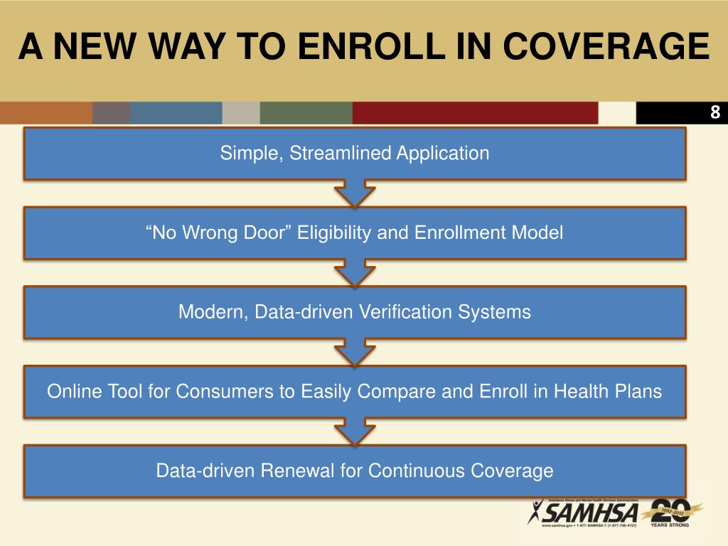 SAMHSA Enrollment Coalitions Initiative • Supporting coalition groups in their commitment to promoting access to insurance for their constituents • Inviting coalition groups to shape enrollment support policy, planning, training and materials development • Providing leadership for other organizations